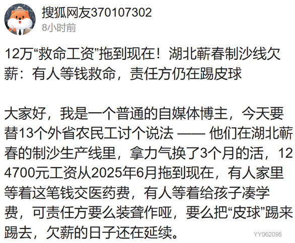 大家好,我是一个普通的自媒体博主,今天要替13个外省农民工讨个说法 —— 他们在湖北蕲春的制沙生产线里,拿力气换了3个月的活,124700元工资从2025年6月拖到现在,有人家里等着这笔钱交医药费,有人等着给孩子凑学费,可责任方要么装聋作哑,要么把“皮球”踢来踢去,欠薪的日子还在延续。